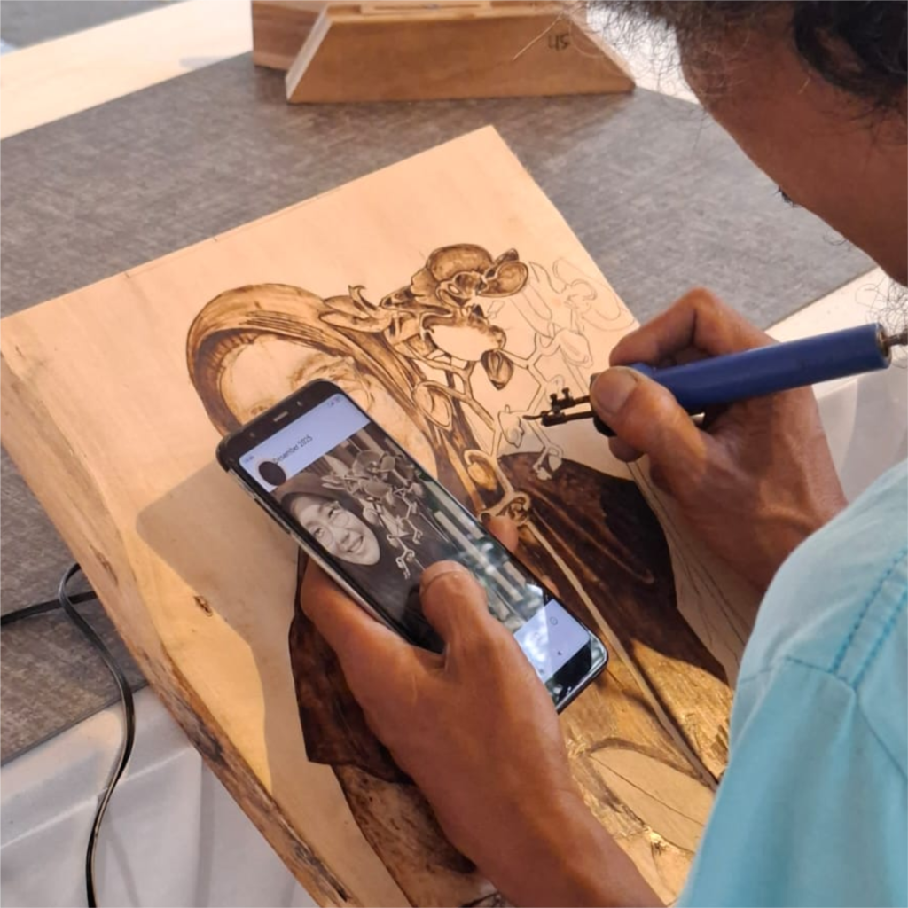 Lukisan detail yang dibakar langsung pada permukaan kayu, menciptakan karakter unik yang tidak dapat direplikasi mesin.